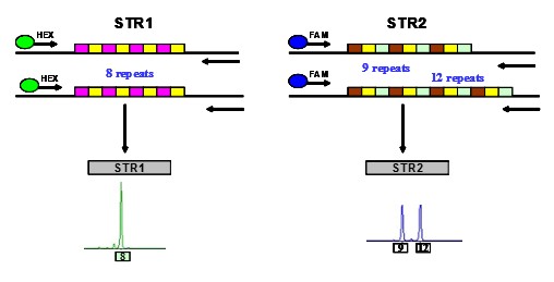 微衛(wèi)星標(biāo)記(Microsatellite)也稱(chēng)為短串聯(lián)重復(fù)序列(STR)或簡(jiǎn)單重復(fù)序列(SSR),是廣泛分布在真核生物基因組中的簡(jiǎn)單重復(fù)序列。微衛(wèi)星位點(diǎn)通常通過(guò)PCR擴(kuò)增和電泳檢測(cè),并根據(jù)片段大小分離等位基因進(jìn)行分析;擴(kuò)增后的等位微衛(wèi)星可以用多種方法檢測(cè),傳統(tǒng)方法采用聚丙烯酰胺凝膠電泳加放射顯影或銀染的方法,費(fèi)時(shí)費(fèi)力效率低。我們利用ABI遺傳分析儀對(duì)熒光標(biāo)記的DNA片段進(jìn)行檢測(cè),結(jié)合分子量?jī)?nèi)標(biāo)進(jìn)行DNA片段長(zhǎng)度計(jì)算,使STR分型變得高效快捷,結(jié)果也更加精確。