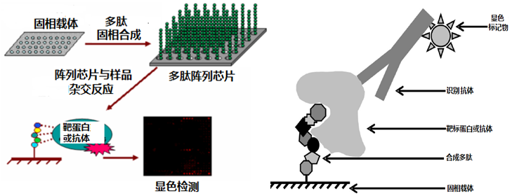 作為一種高通量研究工具,多肽陣列是一種高效的生物芯片。根據(jù)已知蛋白質(zhì)序列,截取連續(xù)或非連續(xù)的氨基酸片段(5-20個氨基酸),又稱多肽,使用自動化儀器通過原位合成技術(shù)將上述多肽或特意設(shè)計的成百乃至上千的多肽以極高的密度置于特殊處理的載體矩陣之上(濾紙等),合成好的陣列芯片與樣本(如血清,抗體溶液及任何其它蛋白質(zhì)溶液)中的目標(biāo)蛋白進行反應(yīng),用以闡明已知蛋白相對于目標(biāo)蛋白的結(jié)合或識別位點(如抗原表位)。使用這種生物芯片,科學(xué)家們能夠直接揭示蛋白質(zhì)之間相互作用的秘密。