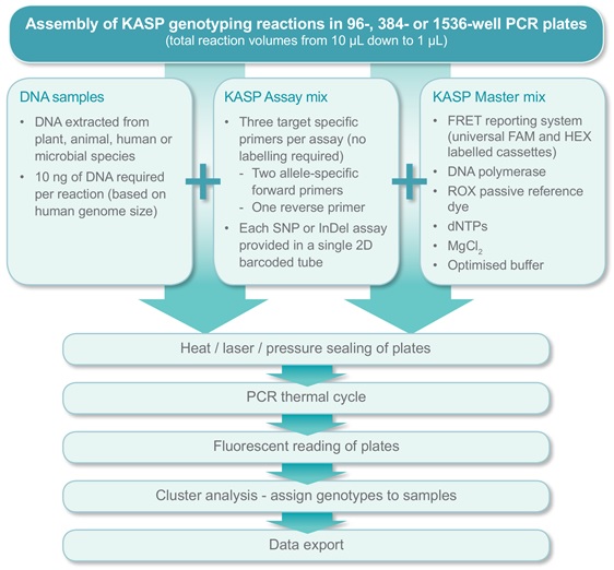 由于KASP實驗方案的高度靈活性,其應(yīng)用也十分廣泛,適合于各種基因分型研究,無論是中低通量SNP研發(fā)項目,NGS之后的SNP驗證,農(nóng)業(yè)種群研究,或者大量種子的生產(chǎn)QC和生物樣品庫 DNA Biobanking等都是其適用的范圍。