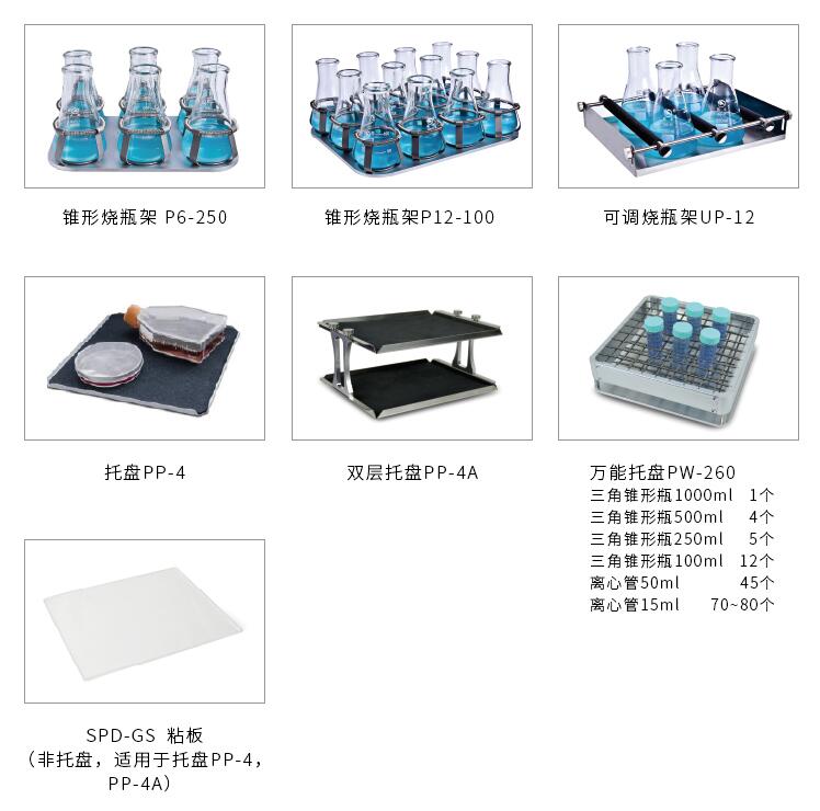 5、可更換不同容器的載物臺(tái),備有錐形燒瓶架、可調(diào)燒瓶架、通用托盤可供選配。