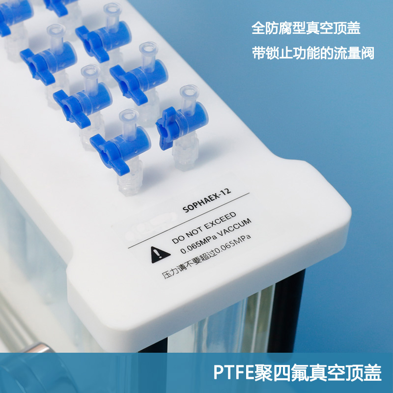 Sophaex 12 附帶的收集架,可同時(shí)進(jìn)行12個(gè)SPE萃取操作,裝置配備的真空玻璃缸,可以讓使用者對(duì)收集樣品過程一目了然,Sophaex 12 頂蓋、底座及試管收集架全部采用防腐材料,耐強(qiáng)酸強(qiáng)堿,經(jīng)久耐用。裝置配置真空表及調(diào)壓閥組建,可進(jìn)行簡(jiǎn)單調(diào)節(jié)真空度。