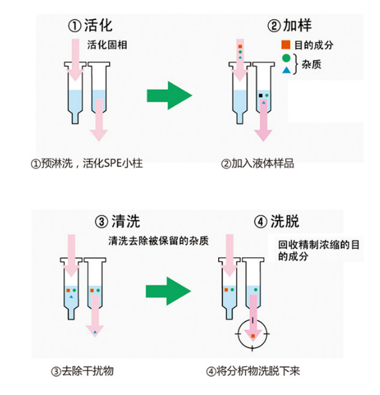 固相萃取(簡(jiǎn)稱SPE),是一種包括液相和固相的物理萃取過程,被廣泛應(yīng)用并且備受歡迎的樣品前處理技術(shù)。它是通過填料的鍵合功能團(tuán)和待分離化合物之間的作用力,將目標(biāo)化合物與樣品基質(zhì)分離,然后再用洗脫液洗脫或加熱解吸附來達(dá)到分離和富集目標(biāo)化合物的目的。