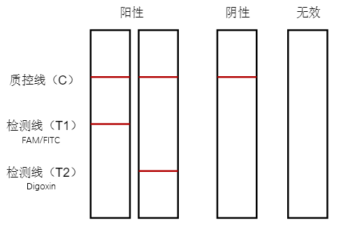 檢測卡出現(xiàn)質(zhì)控線(C)和檢測線(T2),都是紅色條帶,則靶標(biāo)2為陽性;