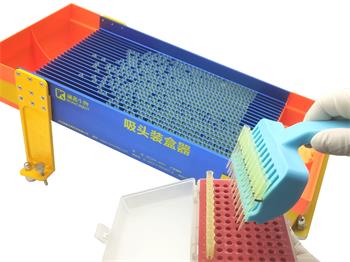 將吸頭倒入操作臺(tái)面上端,左右搖晃移液器裝盒器使吸頭通過(guò)斜置滑道進(jìn)使吸頭進(jìn)入各條卡槽內(nèi),再清沒(méi)有進(jìn)入槽入的吸頭;將后接料槽切換為接料模式,用12齒吸頭取出器從下接料托從下向上取出吸頭裝入吸頭盒,重復(fù)進(jìn)8次裝滿一盒;10ul白吸頭一次約可以裝4-8盒之間,黃吸頭約可以裝4-5盒之間(裝盒數(shù)量多少主要因素滑道里吸頭數(shù)量,重復(fù)添料次數(shù)。)